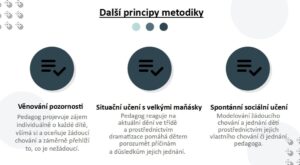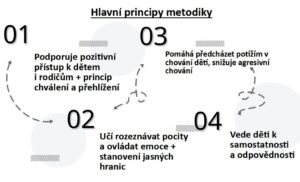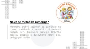 1) Metodika ,,Dobrý začátek“ – představuje konkrétní způsoby práce na rozvoj sociálních a emočních kompetencí dětí ve věkovém rozmezí zhruba od 2 do 7 let. Hlavní témata metodiky jsou navazování a udržování dobrých vztahů, strategie práce s nevhodným chováním dětí, zvládání vzteku a agresivity, vyjadřování pocitů a emocí. K tomu nám napomáhají dva maňásci – Kubík a Adélka, kteří znázorňují pomocí situačního učení scénky, které děti společně řeší. Tím také posilujeme prosociálního chování, kooperativní dovednosti a elementární poznatky, schopnosti a dovednosti důležité pro navazování a rozvíjení vztahů dítěte k druhým lidem.