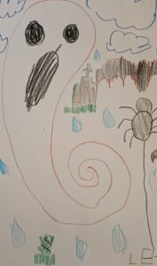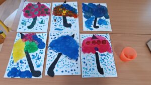 V úterý děti pracovaly s temperovými barvami a vytvářely les v zimě, s úkryty, kde mohou zvířátka přezimovat. Technika výtvarky byla práce se štětcem ( strom, úkryty zvířat, půda a obloha, a prstová technika ( sníh).