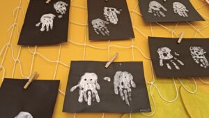 V rámci výtvarky jsme jim připravili na balicím papíru barevnou rukavici, kterou si děti vodovými barvami podle své fantazie vymalovaly.