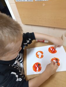 Výtvarné činnosti byly zaměřeny na jemnou motoriku, práci s nůžkami, lepidle. Při výtvarce si děti cvičily orientaci na ploše, pojmenování částí těla, porozumění a zrakové vnímání.