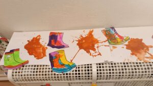 V rámci výtvarky jsme jim připravili na balicím papíru barevnou rukavici, kterou si děti vodovými barvami podle své fantazie vymalovaly.