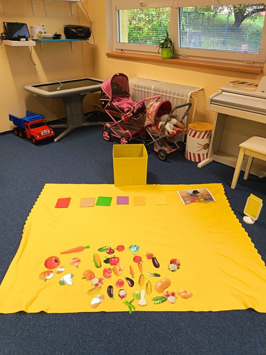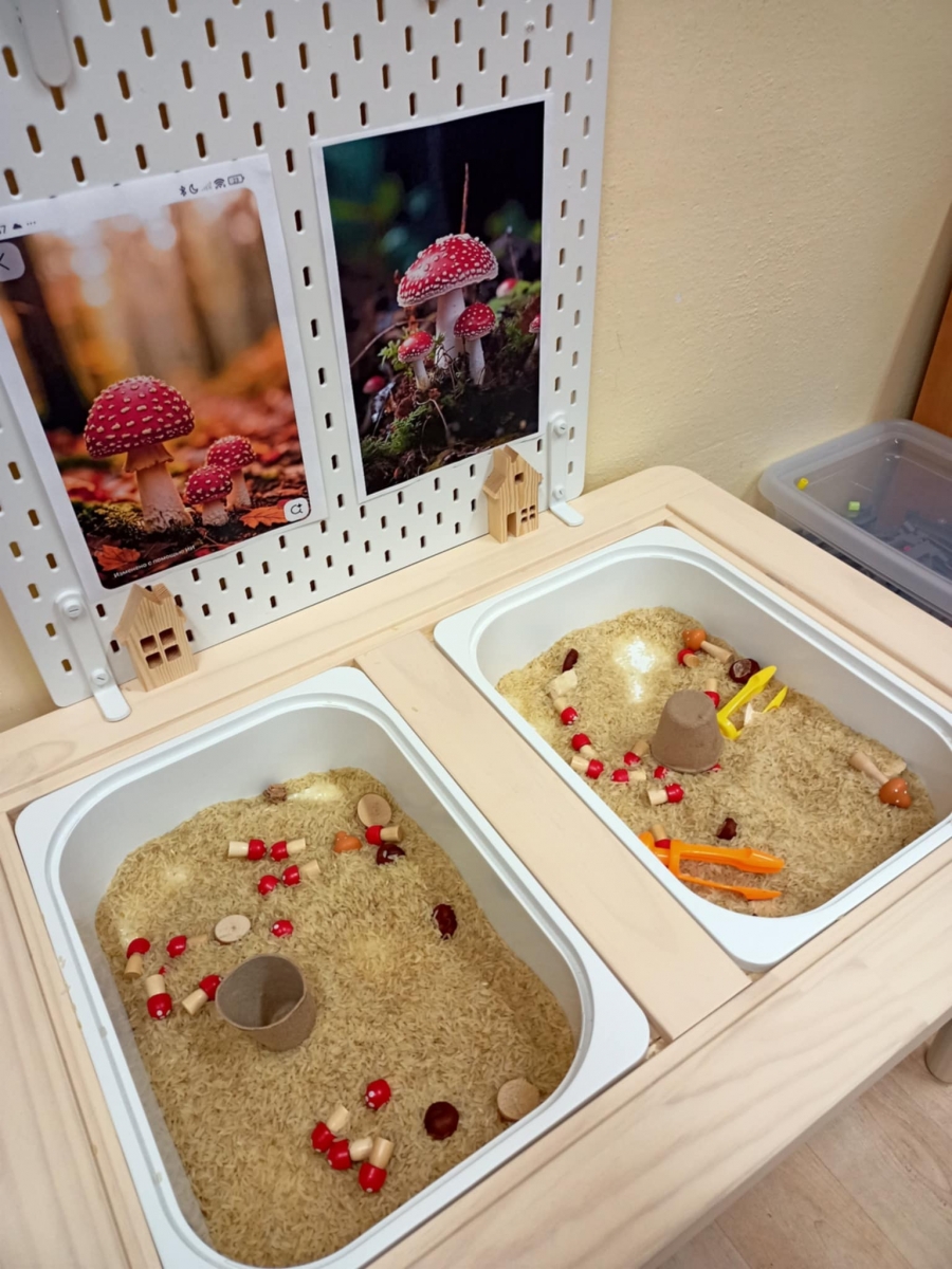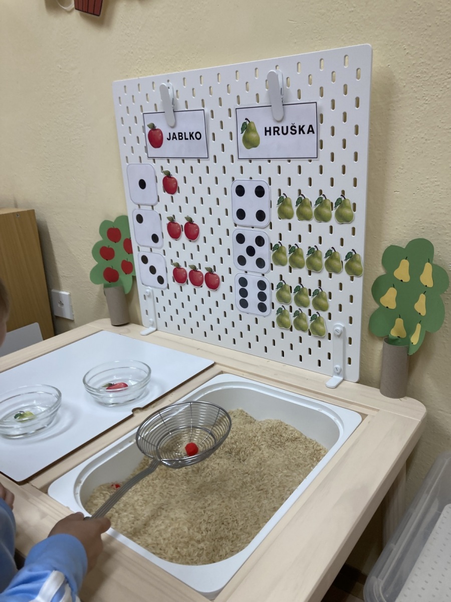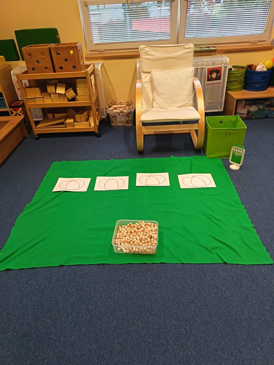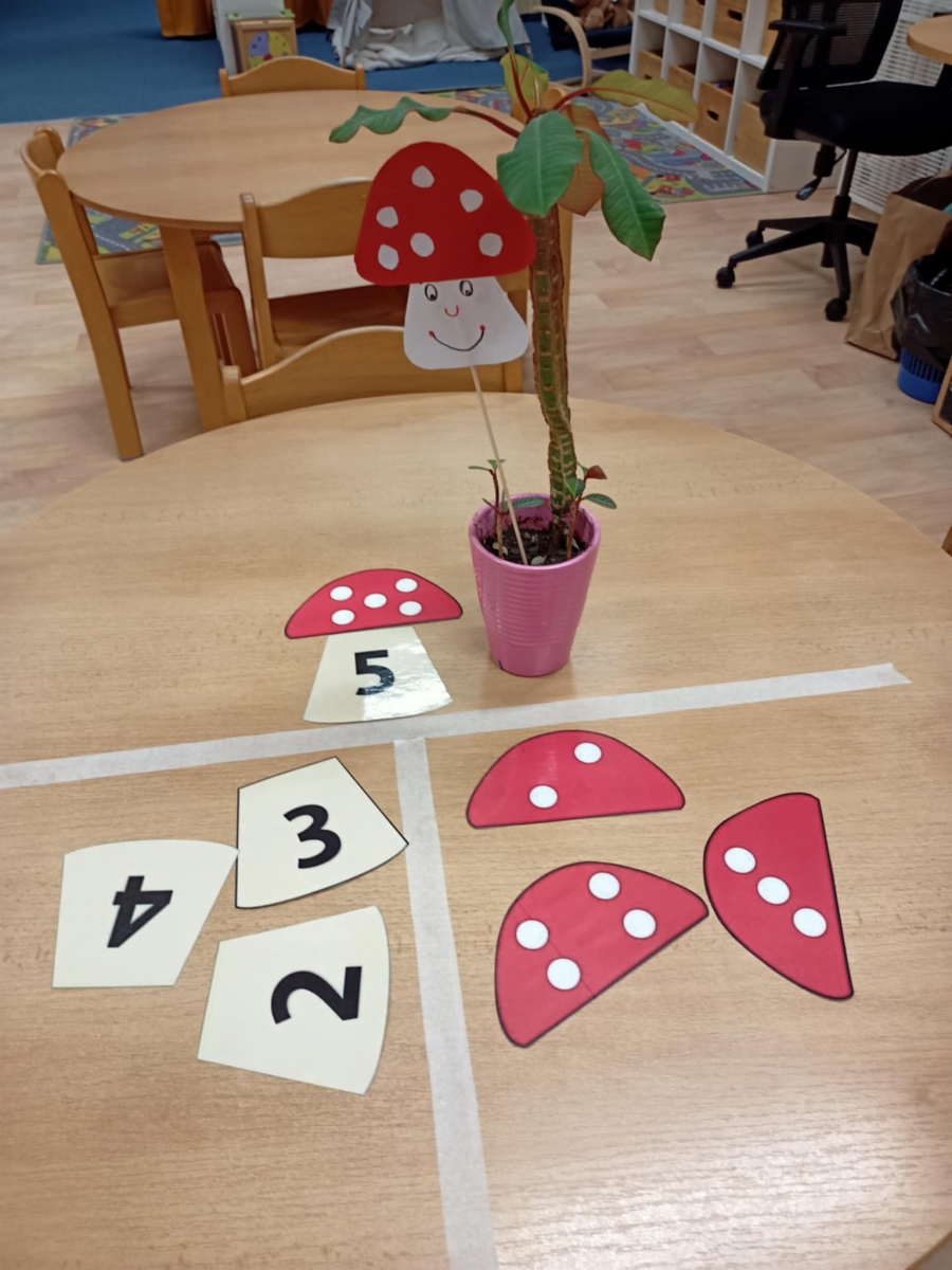 Také si procvičily zrakové vnímání při hledání obrázků hub , které byly chované po celé herně , při skládání obrázků podle čísel i předmatematickou gramotnost.