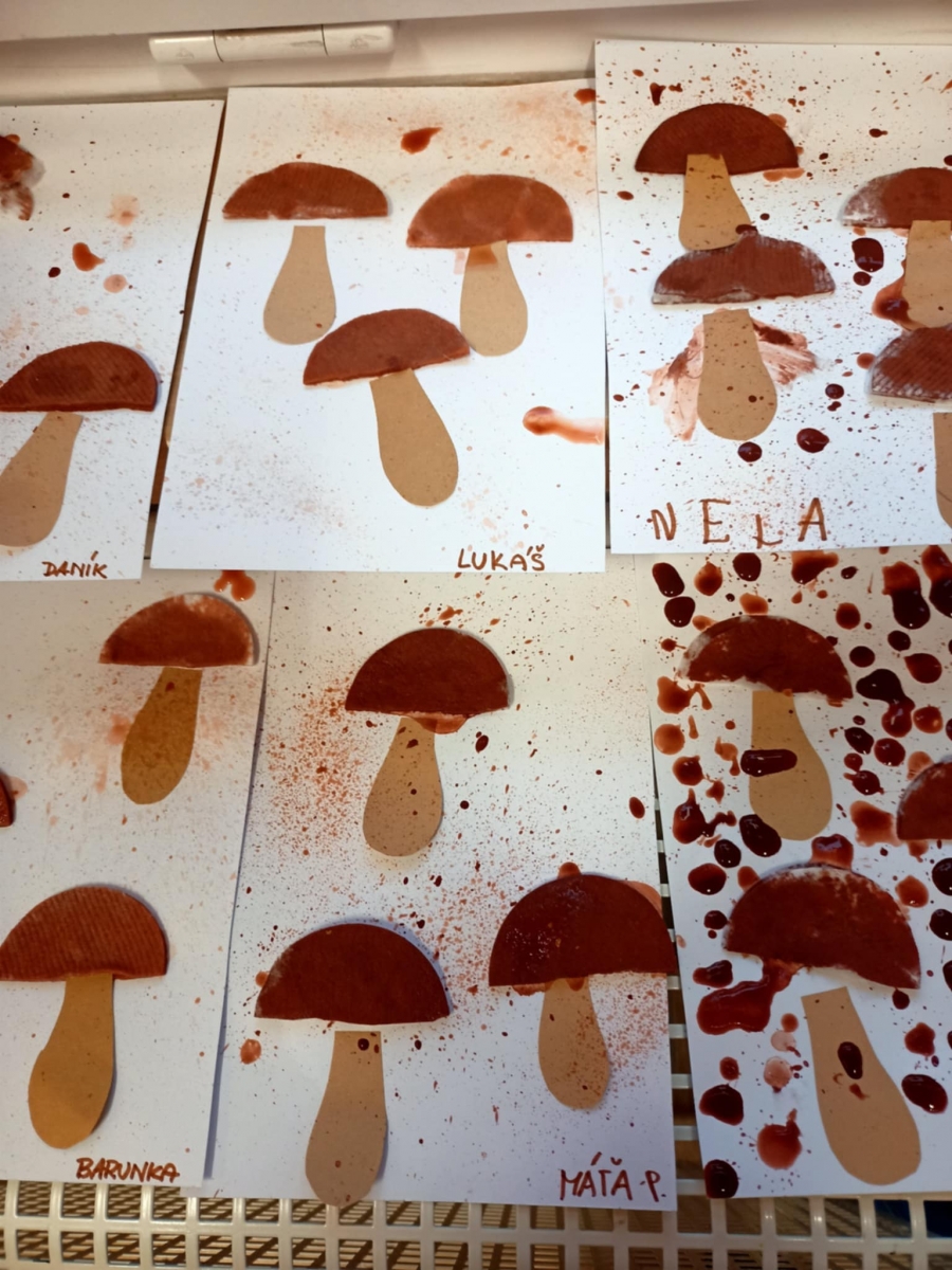 Téma houby patří mezi oblíbené podzimní činnosti , kdy se děti seznamují se základními druhy hub a jejich rozdělením na jedlé a jedovaté. Děti pozorovaly houby v lese na vycházkách, také je podrobně zkoumaly pod mikroskopem a sledovaly pokus, jak houba nasává vodu. Naučily se písničku Hádaly se houby a básničku Houbař v lese. Zahrály si pohybovou hru Na houbaře a na Barevné houby- při té rychle reagovaly na domluvený signál. Při výtvarných činnostech děti modelovaly houbám “ obličeje“ – smutné, veselé i překvapené, také si z vatových tamponků nalepily hříbky na čtvrtku a jejich kloboučky napouštěly pomocí pipety hnědou barvou.