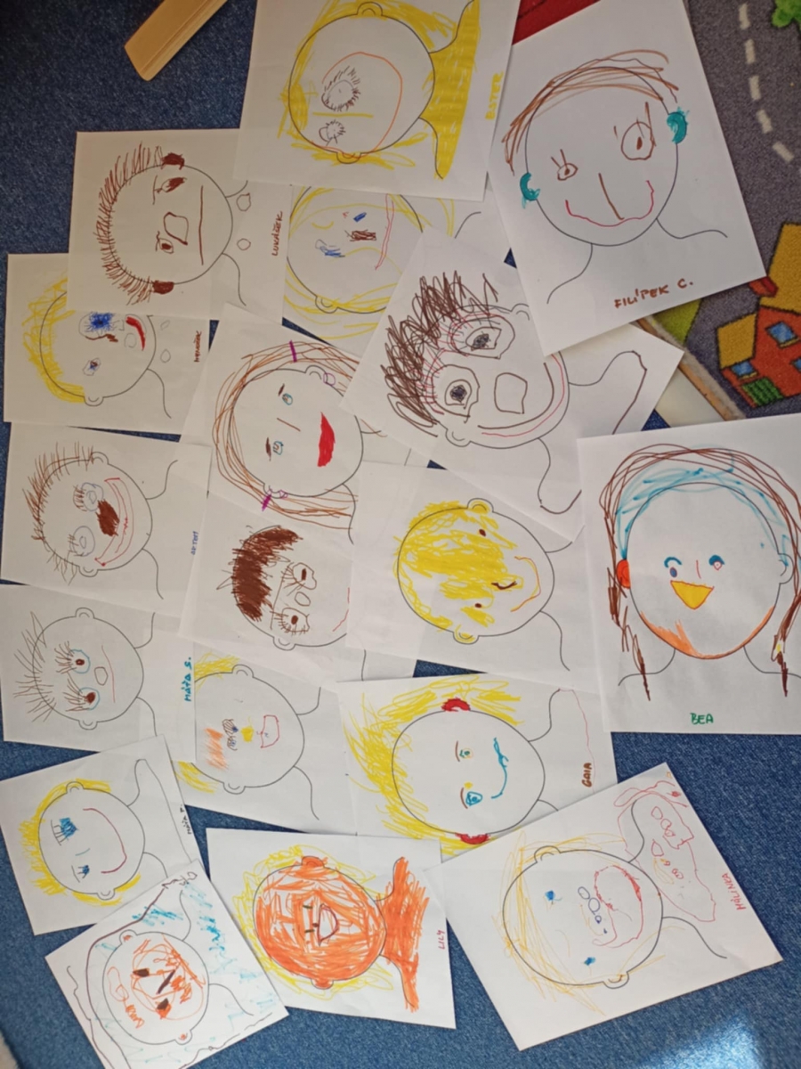 Obkreslili jsme kamaráda na velký formát papíru a dokreslovali jsme, co mu chybělo (oči, nos, ústa, vlasy, oblečení, atd.).