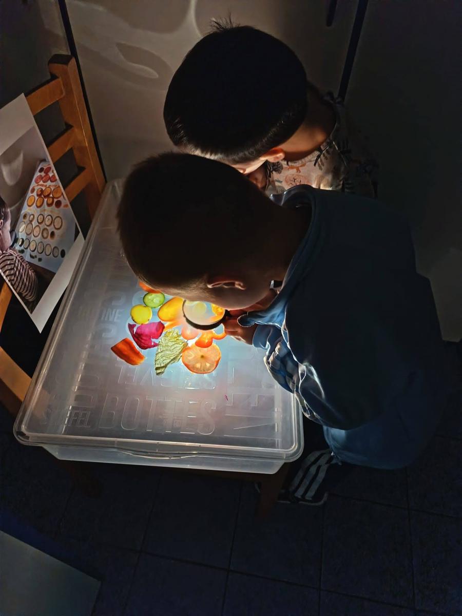 - Týdenní téma „Poznávání všemi smysly“… v hlavní roli pohádka O Perníkové chaloupce. Ve třídě jsme si prohlédli ručně vyrobené stínové divadlo, byl to velký zážitek. Dokonce jsme si vyzkoušeli sami vytvářet stíny pomocí světla a vystřižených obrázků.